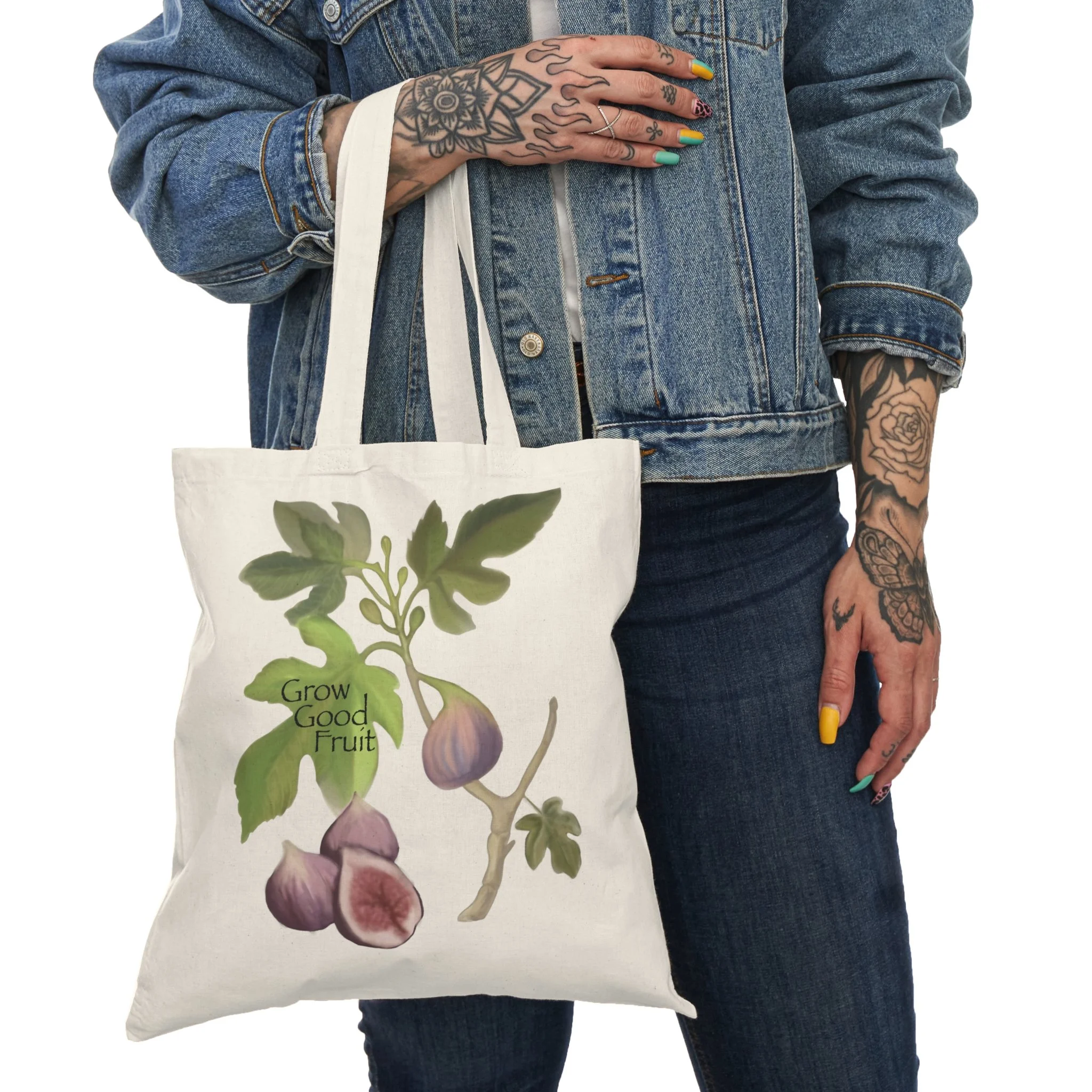 A sturdy cotton canvas tote printed with fig branches. The artwork includes the phrase "Grow Good Fruit." The flat-corner construction gives a clean, compact silhouette that slides easily under an arm. Handles are reinforced for reliable carrying, and the heavyweight canvas promises longevity so the tote weathers seasons of use without losing its charm. Available in natural or black.